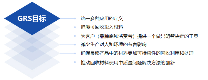 全球回收標準(GRS)是一個國際性、自愿性的完整產(chǎn)品標準。內容針對供應鏈廠商對產(chǎn)品回收/再生成分、監(jiān)管鏈的管控、社會責任和環(huán)境規(guī)范、以及化學品的限制的執(zhí)行,并由第三方認證機構進行認證。GRS認證是為了滿足企業(yè)為驗證的產(chǎn)品(包括成品和半成品)所含的回收/再生成分,同時并驗證社會責任、環(huán)境規(guī)范和化學使用的相關作業(yè)。GRS的目標是確保在相關產(chǎn)品上的聲明為正確負責任的。此標準適用于生產(chǎn)或銷售GRS產(chǎn)品的所有公司(單位)。包括加工、制造、包裝、卷標,銷售和使用的所有產(chǎn)品內含量至少20%的再生材料。被認證的產(chǎn)品范圍是基于紡織產(chǎn)品概念,但認證范圍不限于紡織產(chǎn)品行業(yè)。GRS任證體系可以適用于供應鏈的所有單位:包括所有加工單位到最終買家端的商業(yè)至商業(yè)(B2B)交易。